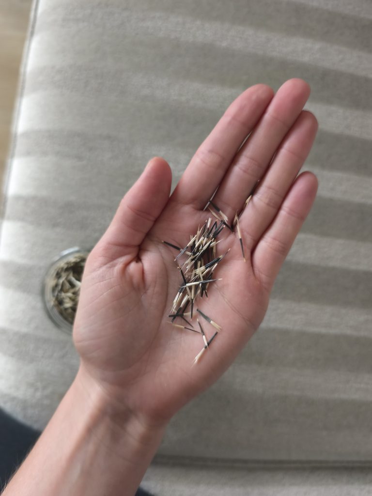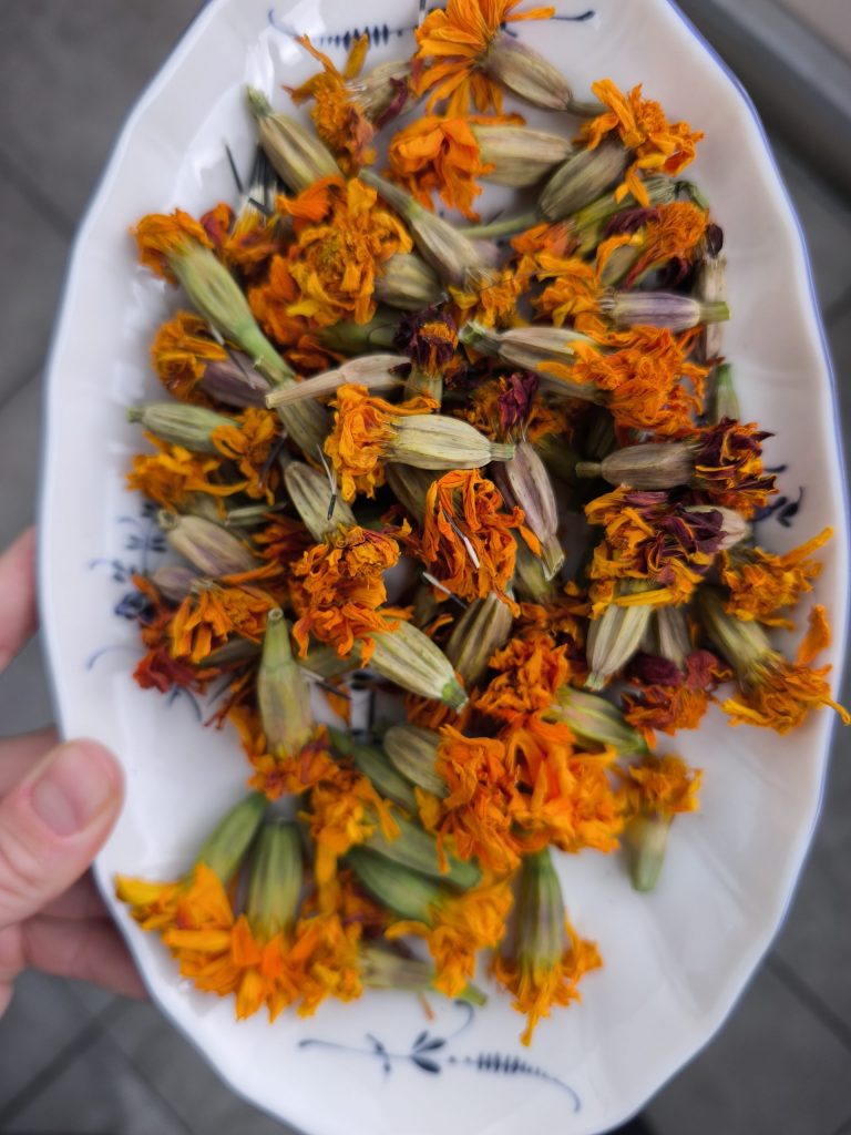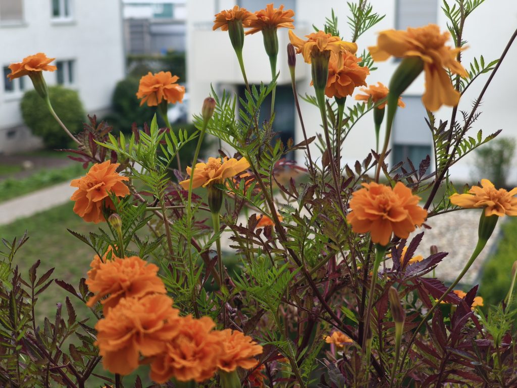 Zum Abschluss ein paar wichtige Pflegehinweise für alle Tagetes-Fans: Die Pflänzchen sind ziemlich durstig, mögen aber keine Staunässe. An sehr heißen Tagen gieße ich sie zwei Mal täglich und schaue einfach, wie sie aussehen und wie der Zustand der Blüten und Blätter ist. Wenn die Sonne weg ist, besprühe ich sie gerne mal mit Wasser und entferne ausgetrocknete Blätter. Das Verblühte schneide ich mit einer scharfen sauberen Schere ab, lasse es trocknen und lagere die entnommenen Samen an einem dunklen Ort. Wenn ich jemanden sehr mag, verschenke ich meine Babys auch gerne mal.