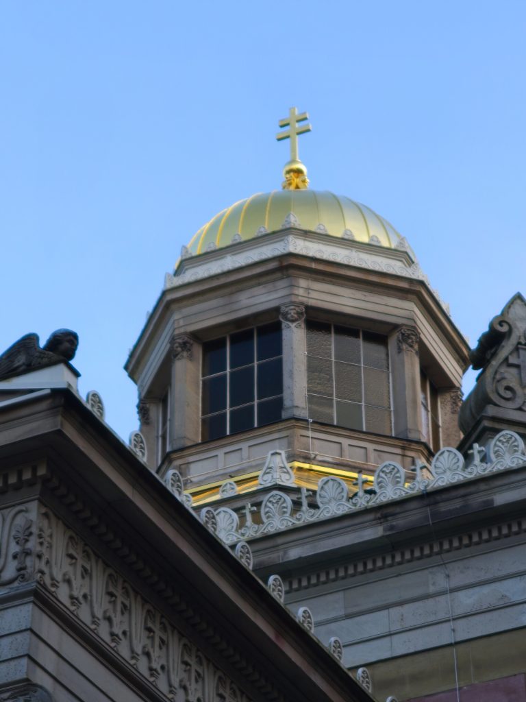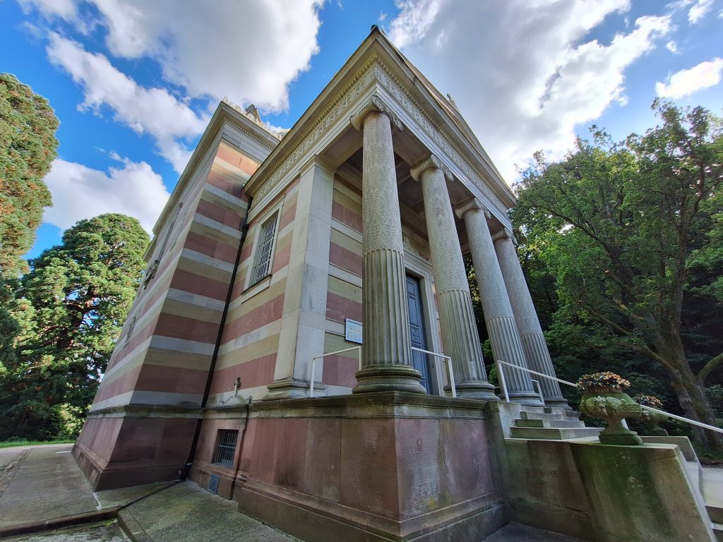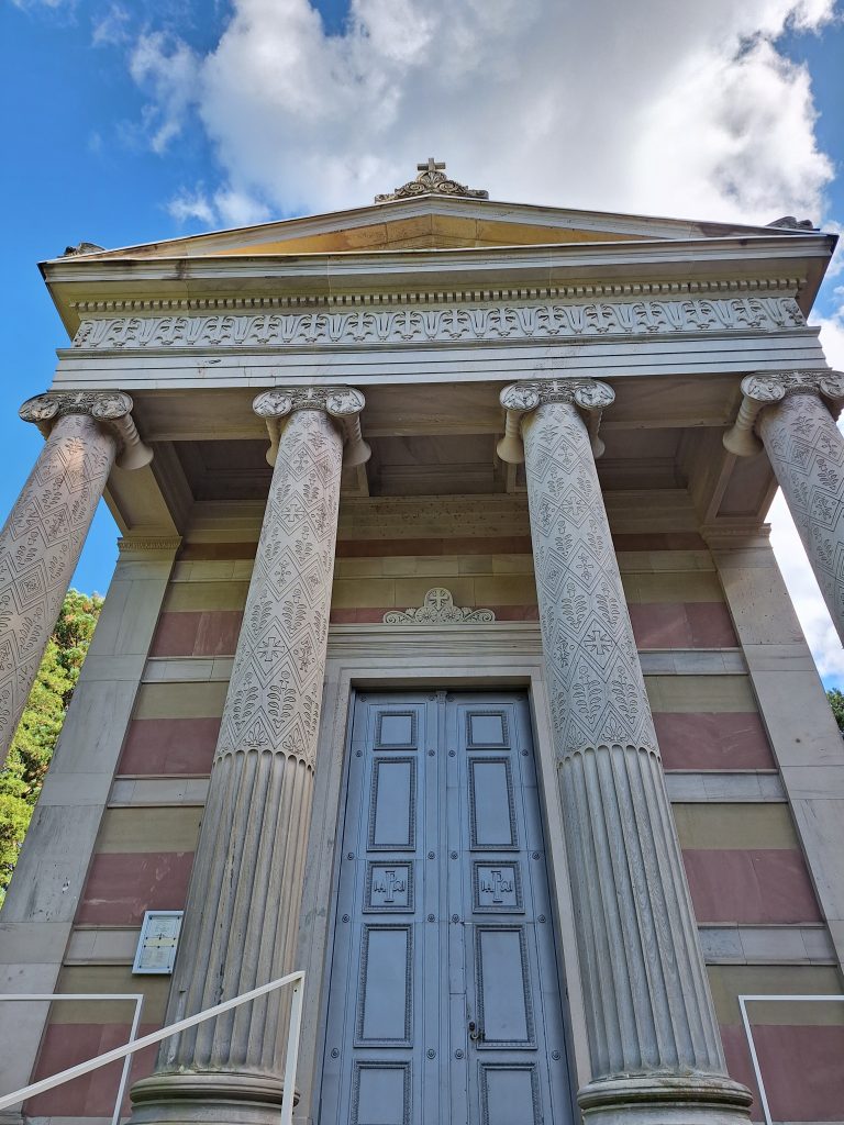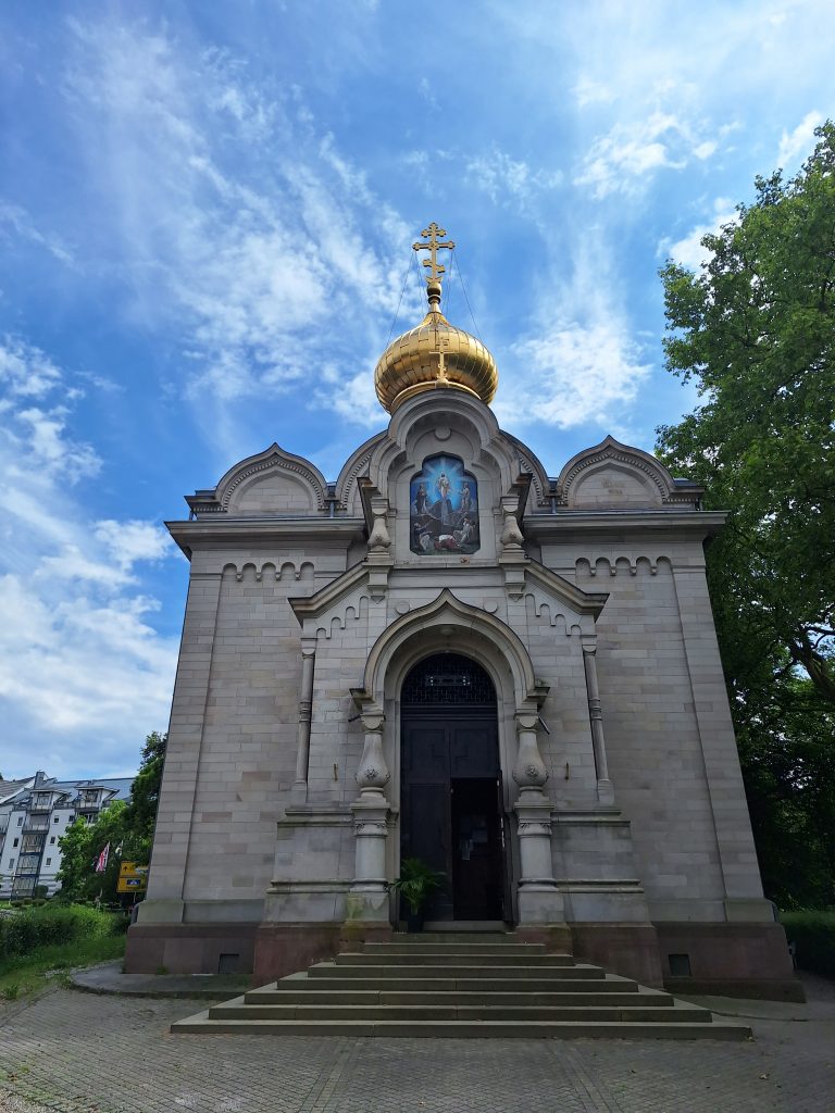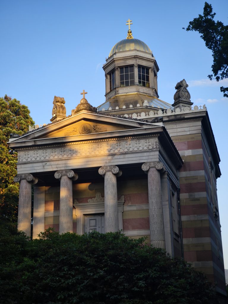 So einfach lässt die Stourdza-Kapelle sich jedoch nicht betreten. Man muss schon einen Termin erbitten, um sie von innen zu sehen. Von außen sehen wir einen kubischen Baukörper, dessen Wandflächen abwechselnd mit weißem, rotem und gelbem Sandstein „gestreift“ sind. Die Vorhalle wird von vier ionischen Säulen getragen. Diese Kirche ist für mich immer wieder ein krönender Abschluss, nach einem Spaziergang auf dem Michaelsberg.