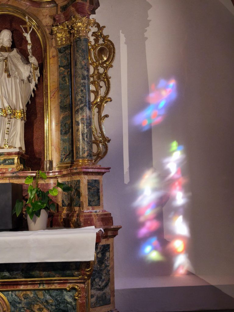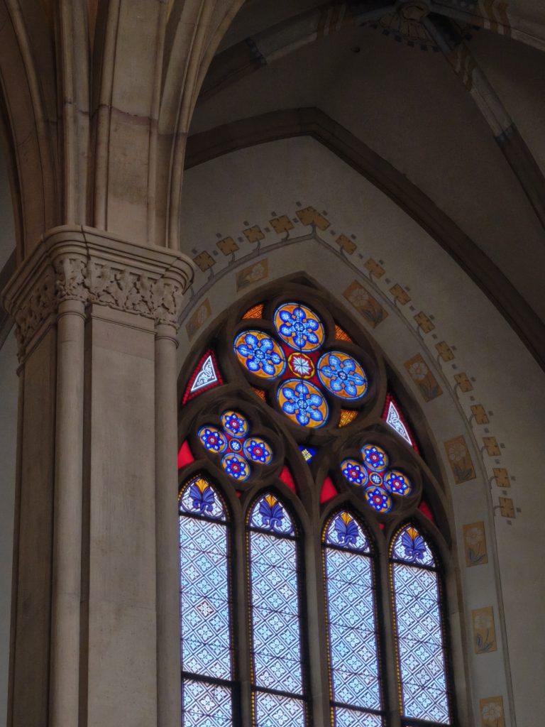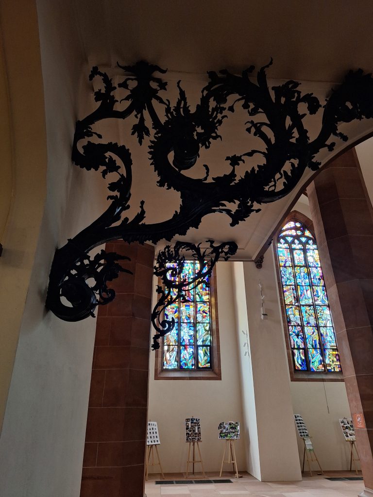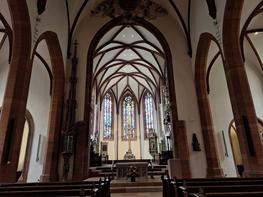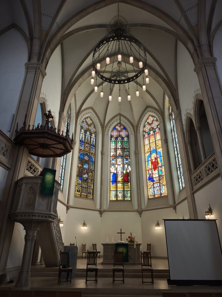 Die Stadtkirche ist meistens geschlossen, weshalb ich sie heute erstmals, nach all den Jahren, betreten habe. Wunderschön – auch von innen: Im Hauptschiff finden wir spitzbogige Fenster mit farbigen Glasmalereien, die viel Tageslicht hineinlassen. Das Kreuzrippengewölbe überspannt den gesamten Raum und über der Empore am Eingang steht seit 1973 eine eindrückliche Orgel, auf der während meines Besuchs fleißig geprobt wurde. Ein magischer Moment, der mir für lange Zeit im Herzen bleiben wird. Die Deckenhöhe beträgt schätzungsweise 15–20 Meter, aber manche von euch werden wissen, wie (un)zuverlässig ich im Schätzen bin, daher Angabe ohne Gewähr.