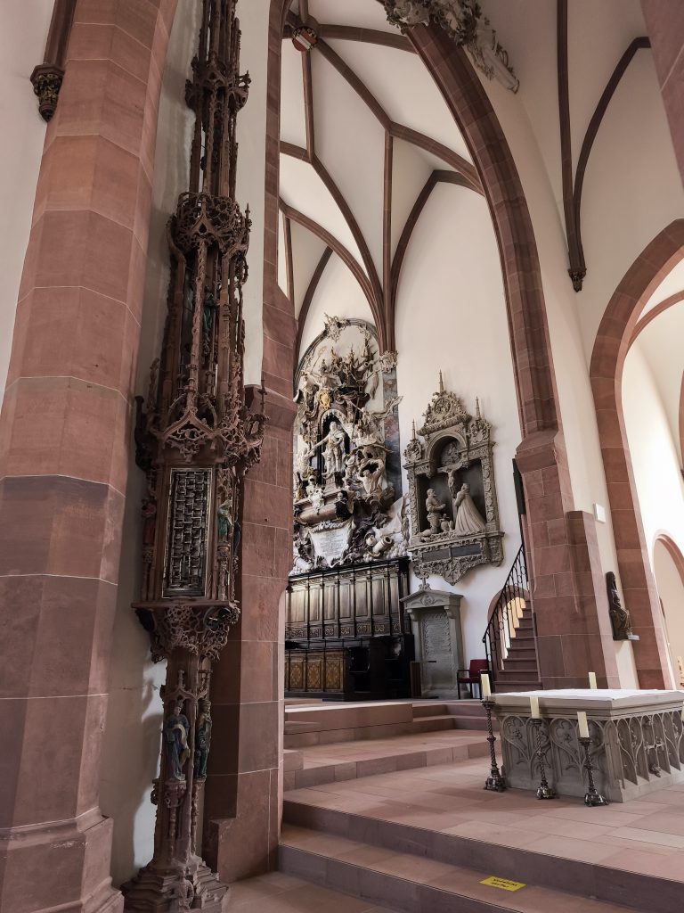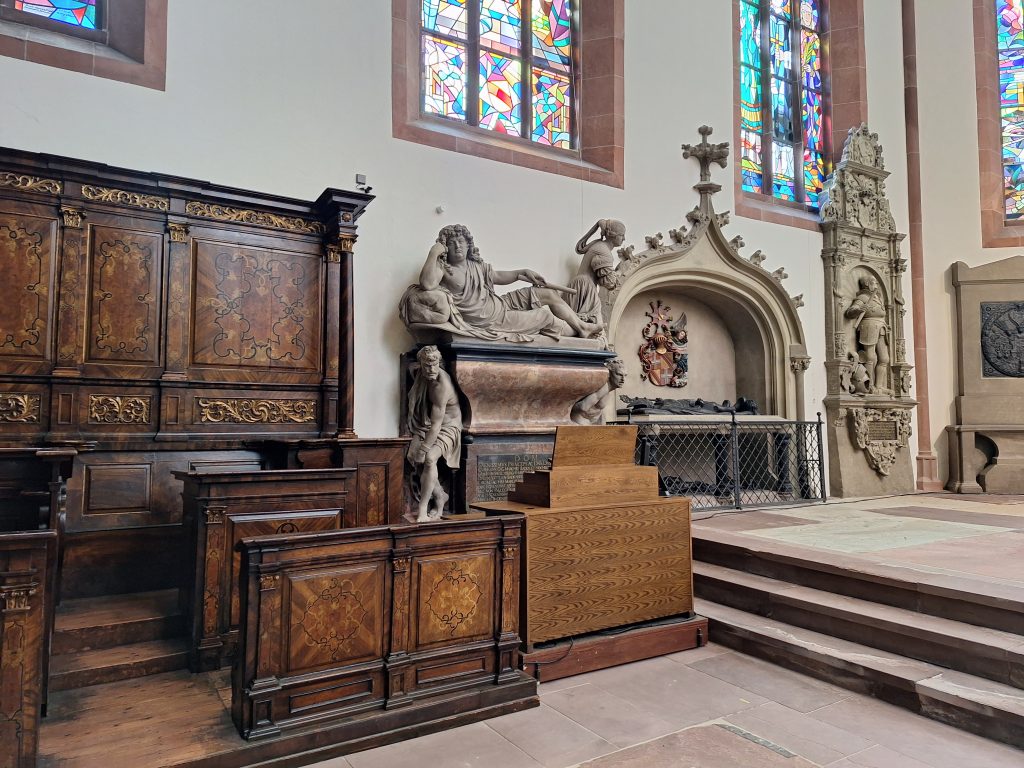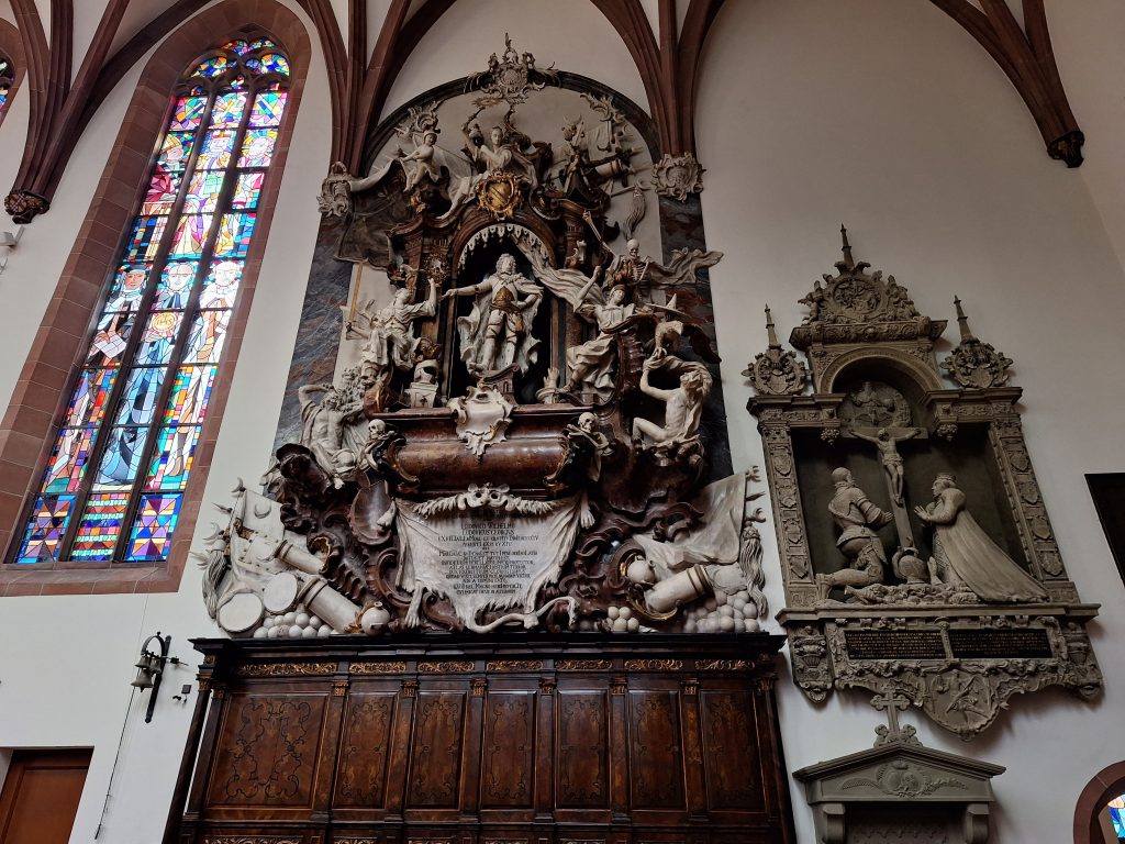 Was erwartet uns im Inneren? Die Kirche ist dreischiffig mit Querhaus und Chor angelegt. Ihre Decken sind von Kreuzrippengewölben überspannt, die von Sandsteinpfeilern getragen werden. Im Chor finden wir das aufwendig gestaltete Hochgrab des Markgrafen Ludwig Wilhelm (Türkenluis). Davor bleibe ich immer besonders lange stehen, egal, wie oft ich es bereits gesehen habe.