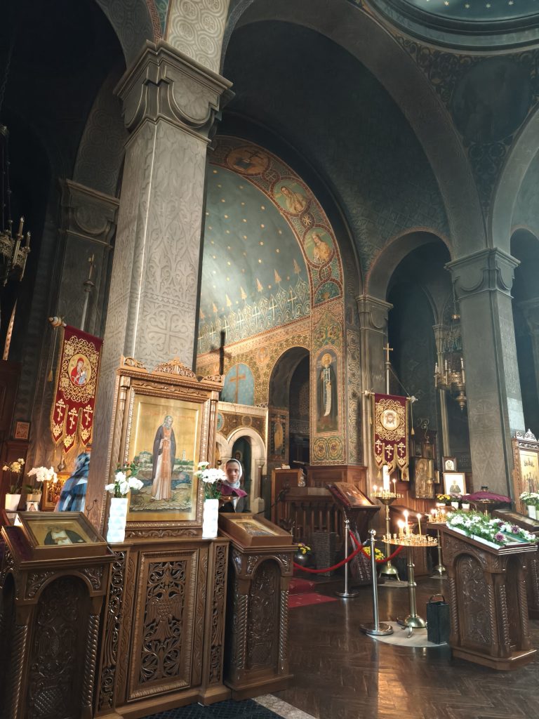 Das Mosaik über dem Portal und der prächtig ausgestattete Innenraum stammen vom „Malerfürsten“ Grigor Gagarin. Eine sogenannte Ikonostase aus weißem Marmor trennt den Altarraum vom Gemeinderaum – der Blick auf den Altar wird, wie in der russischen Kultur üblich, nur zu bestimmten Gottesdienstzeiten freigegeben.