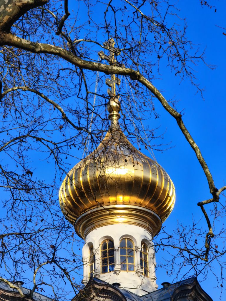 1880 bis 1882 folgt der nächste große Bau: Die russisch-orthodoxe Kirche an der Lichtentaler Straße wird nach den Plänen des St. Petersburger Architekten Iwan Strom errichtet. Sie gehört zum nordrussischen bzw. russisch‑orthodoxen Stil mit byzantinischen Elementen. Ihr Grundriss hat die Form eines griechischen Kreuzes. Das ist auch bei vielen katholischen Kirchen und Klöstern üblich. Wie ihr euch sicher denken könnt, ist das die zweite güldene Kuppel der Stadt. Nur hat sie eine etwas andere Form: Im Deutschen sagen wir „Zwiebelkuppel“ dazu. Diese wird gekrönt von einem dreibalkigen Kreuz.