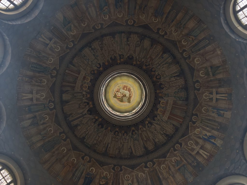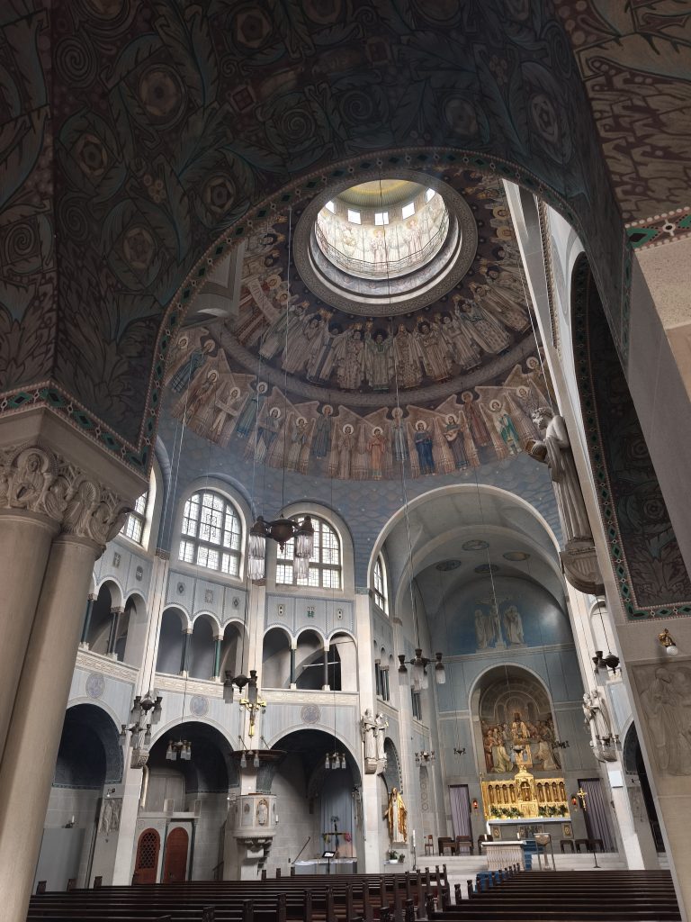 Stilistisch prägend ist außerdem eine byzantinisch-frühchristlich wirkende Architektur, die sich in der zentralen Rotunde mit Kuppel widerspiegelt. Ihre Fresken und das einfallende Tageslicht wirkten auf mich überwältigend. Ganz zu schweigen von der gigantischen Orgel auf der Empore über dem Haupteingang.